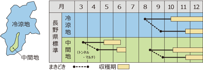 ※中間地:標高300m~600m、冷涼地600m以上(緯度により注意が必要)(植物はその年の気象および土壌条件によって大きく影響されます)